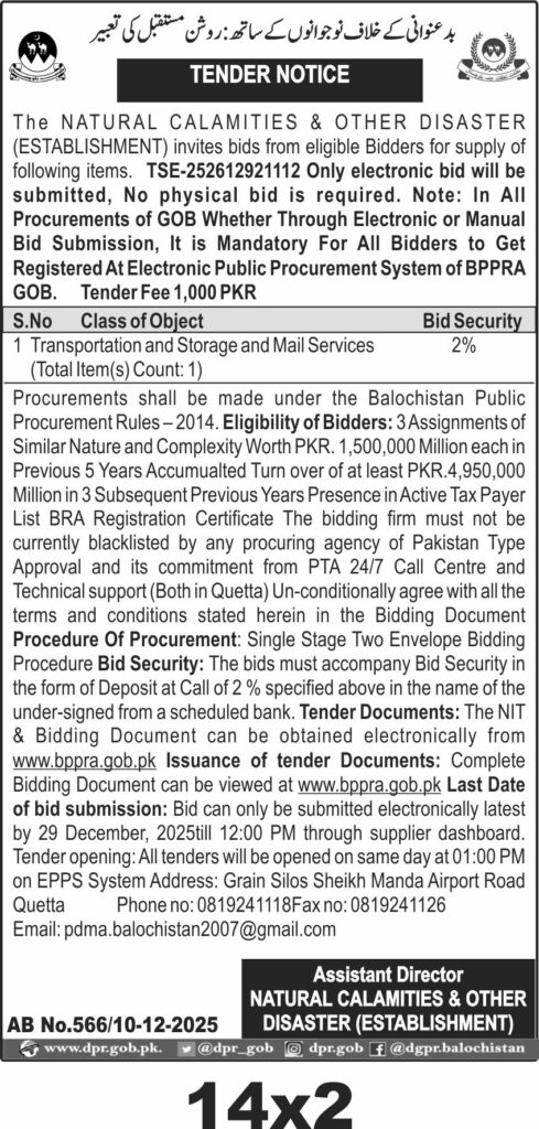 This tender invites electronic bids for the supply of transportation, storage, and mail services in Quetta under the services category. The procurement is managed by the Natural Calamities & Other Disaster Establishment. Bidders must submit bids electronically through the supplier dashboard by the specified deadline.