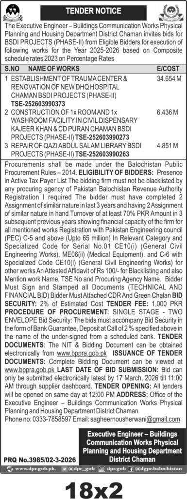 This tender invites bids from eligible contractors for the establishment of a Trauma Center and renovation of the New DHQ Hospital under BSDI Projects Phase-II in Chaman, Balochistan. The Buildings Communication Works Physical Planning and Housing Department District Chaman is overseeing this project, which falls under construction and medical supplies categories.