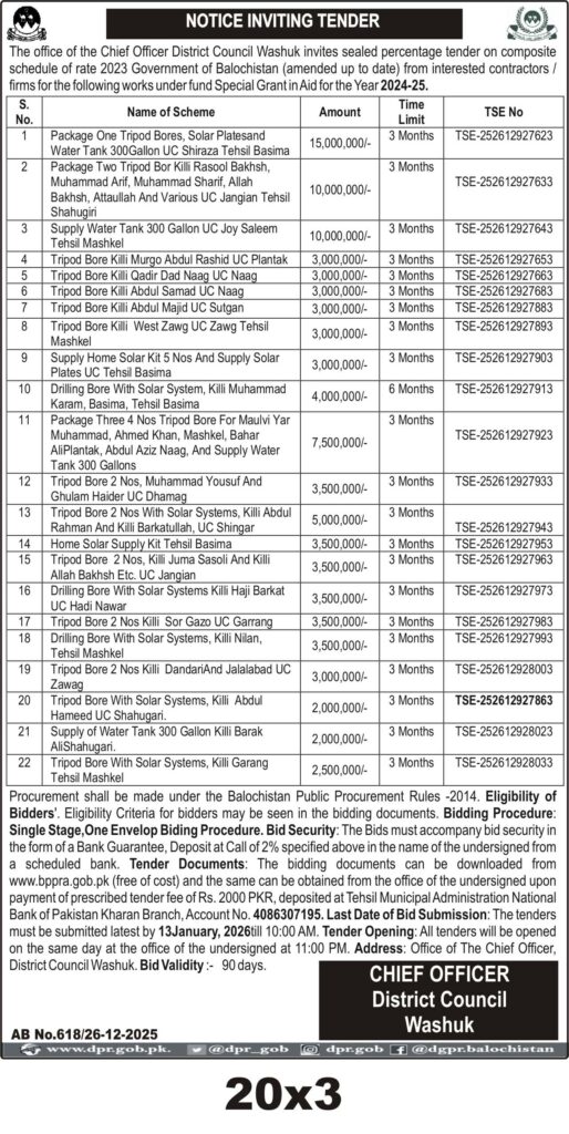 Eligibility criteria and bidding documents are available online and at the office of the Chief Officer District Council Washuk. Bid security and prescribed fees apply. Tender opening is scheduled for the same day as bid submission with a bid validity of 90 days.