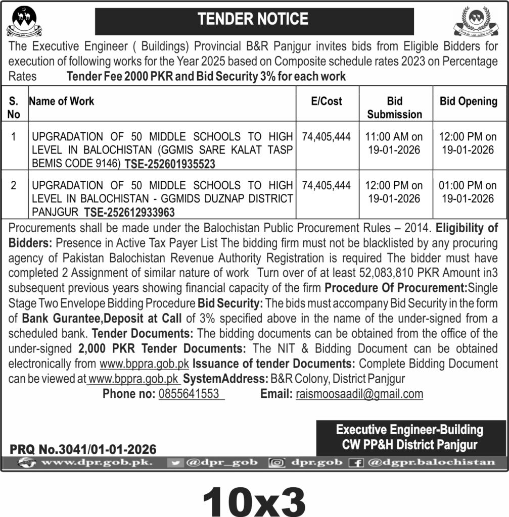 The submission deadline is set for 19th January 2026, with bid opening scheduled shortly after submission times at 12:00 PM and 1:00 PM respectively. Bids must be submitted physically to the office located at B&R Colony, District Panjgur. Interested parties should prepare their technical and financial bids carefully, ensuring all documentation and eligibility criteria are met.