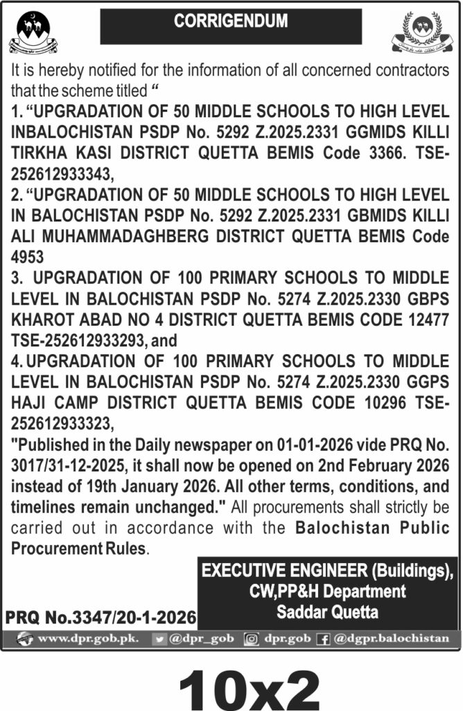The submission deadline is set for 2nd February 2026, with bid opening scheduled the same day. Bids must be submitted physically to the Executive Engineer (Buildings), CW, PP&H Department, Saddar Quetta. Timely submission is critical to avoid disqualification.