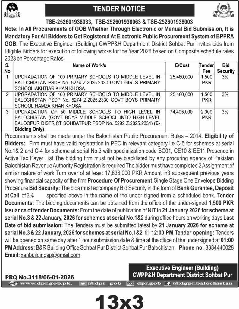 The submission deadline is set for 21 January 2026 at 12:00 PM, with tender opening scheduled one hour later at 1:00 PM. Bidders can obtain documents from the B&R Building Office Sohbat Pur during office hours. The office is located in Sohbat Pur, Balochistan, and can be contacted via phone at 3334440028 or email at xenbuildingsp@gmail.com.