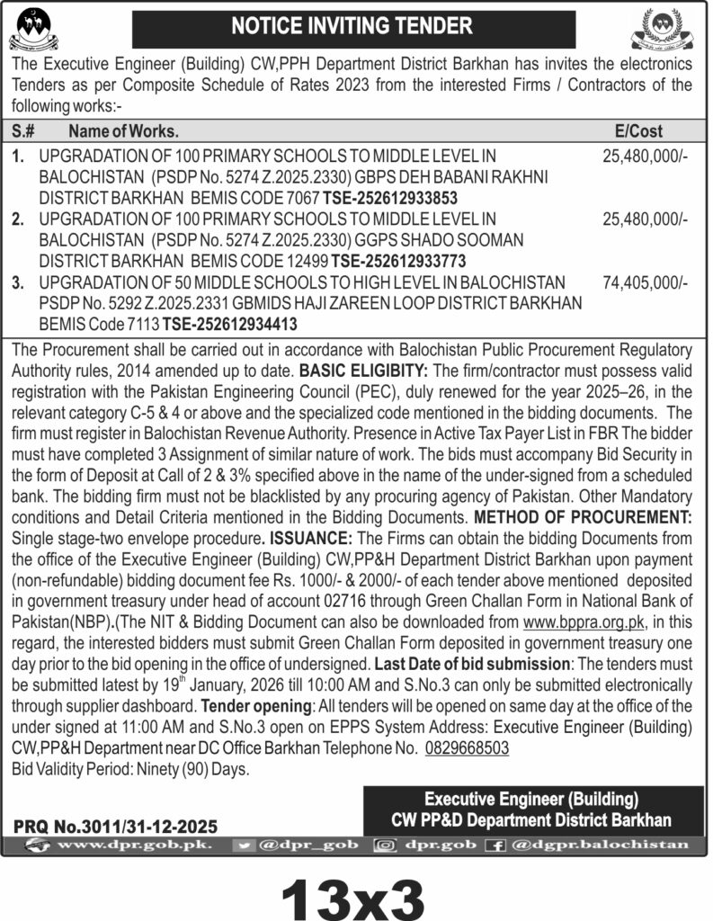 The submission deadline is set for 19th January 2026 at 10:00 AM, with tender opening at 11:00 AM on the same day at the office of the Executive Engineer (Building) CW, PP&H Department near DC Office Barkhan. Tender documents can be obtained from the department office upon payment of non-refundable fees or downloaded from www.bppra.org.pk. Bidders must submit the Green Challan Form deposited in government treasury one day prior to bid opening. The bid validity period is ninety days.