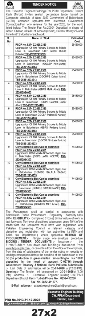 This tender invites contractors in Kech, Balochistan, to upgrade 100 primary schools to middle level and 50 middle schools to high level under the Public Works, Planning & Housing Department. The project involves civil works including structural enhancements, masonry, and finishing to meet educational infrastructure standards. The sites are spread across various locations in Kech district, requiring contractors to manage logistics and local conditions effectively.