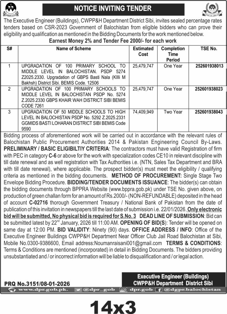 The deadline for bid submission is on the 22nd of January 2026 by 11:00 AM, with bid opening scheduled at 12:00 PM the same day. Bids for the third scheme must be submitted electronically only, while others require physical submission. The office for submission and inquiries is located near Officer Club Jail Road, Sibi. Contact details include mobile 0300-9386600 and email noumanraisani001@gmail.com.