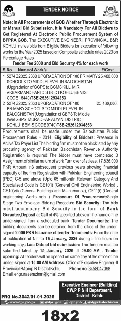 The submission deadline is set for 15 January 2026 at 09:00 AM, with bid opening at 10:00 AM the same day. Tender documents can be obtained from the office of the Executive Engineer-II Provincial B&R District Kohlu upon payment of PKR 2,000. Bids must include a 4% bid security in the form of a bank guarantee or call deposit receipt from a scheduled bank.