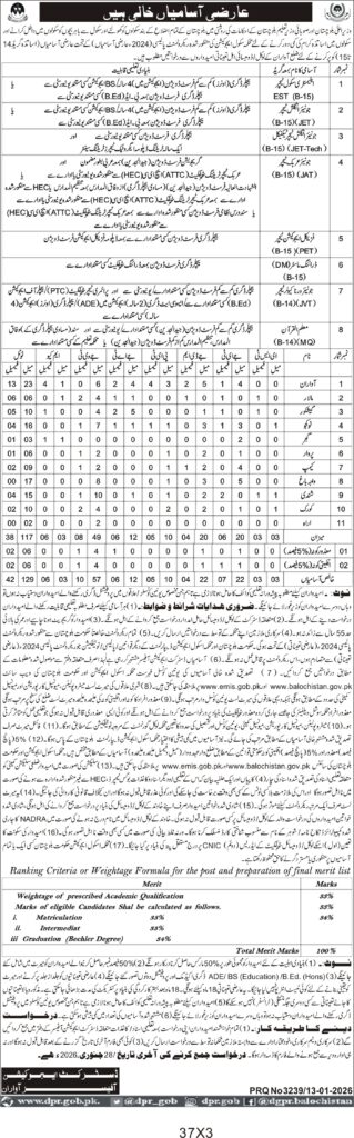 The recruitment includes positions such as EST, JET-Tech, JET, AT, JRF, DMO, and others requiring specific academic qualifications like B.Ed, ADE, and degrees recognized by HEC and ATTC. Candidates from different districts of Balochistan are encouraged to apply, reflecting a broad provincial outreach. The selection process involves merit-based evaluation with weightage given to matriculation, intermediate, and graduation marks.