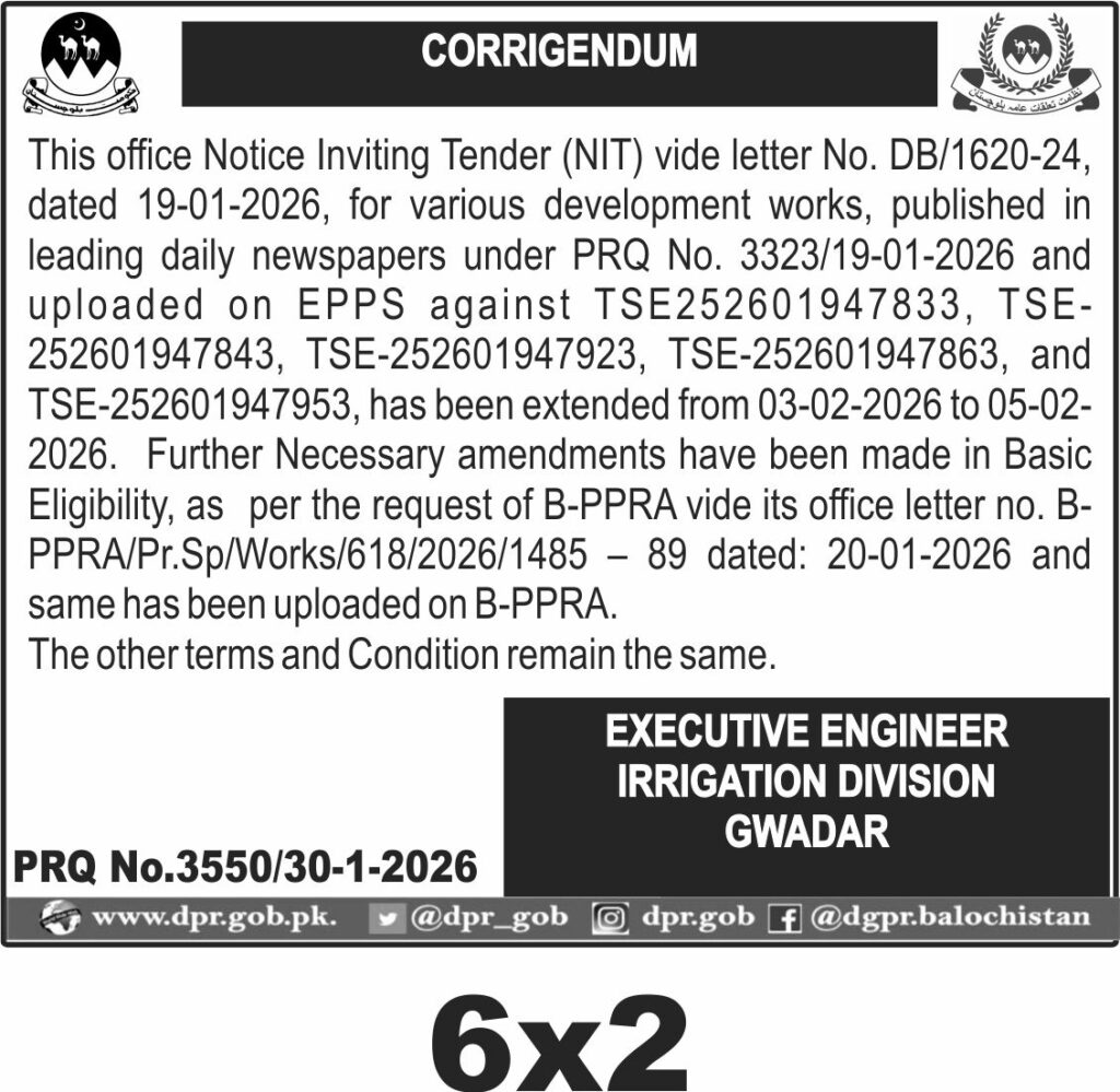 The submission deadline is extended to 05-02-2026, with bids opening shortly after. Interested parties must submit sealed hard copies of their bids to the Executive Engineer, Irrigation Division Gwadar, at the designated office address. Timely submission is critical to avoid disqualification.