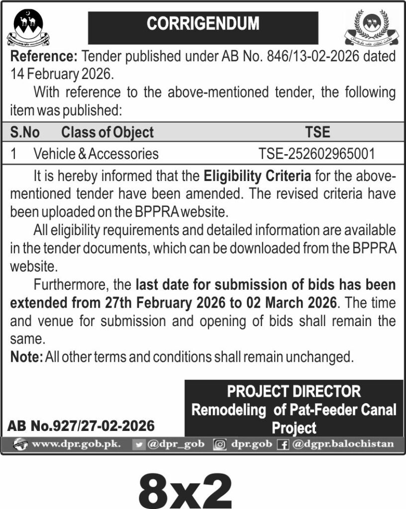 The last date for submission of bids has been extended to 02 March 2026, with the opening of bids scheduled to follow at the same venue and time as previously announced. Interested parties should submit their sealed bids before the deadline at the designated office of the Project Director Remodeling of Pat-Feeder Canal Project.