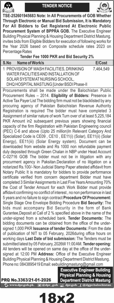 This tender from the Building Physical Planning and Housing Department District Mastung invites bids for the provision of wash facilities, drinking water facilities, and installation of a solar system at the Nursing School of DHQ Hospital Mastung. The project is located in Mastung, Balochistan, and involves civil works combined with electrical solar system installation, requiring expertise in plumbing, sanitary fittings, and solar energy systems.