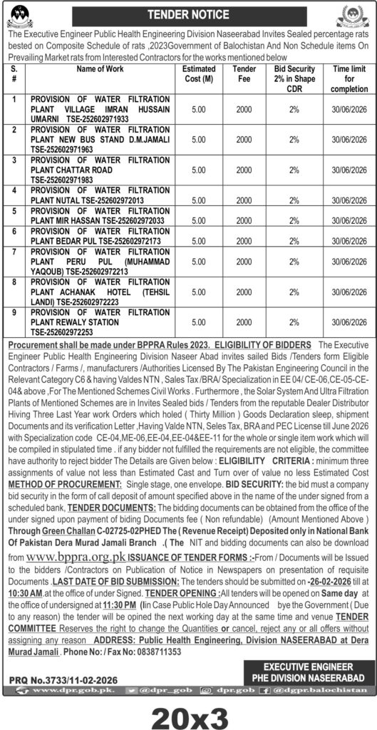 The submission deadline is set for 26-02-2026 at 10:30 AM, with tender opening scheduled the same day at 11:30 AM at the Public Health Engineering Division office in Dera Murad Jamali. Tender documents are available upon payment of a non-refundable fee through a Green Challan at the National Bank of Pakistan, Dera Murad Jamali Branch, and can also be downloaded from the official BPPRA website.