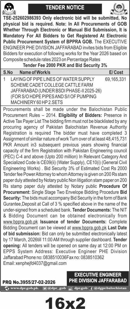 The deadline for electronic bid submission is **17 March 2026 at 11:00 AM** via the supplier dashboard on the Balochistan Public Procurement Regulatory Authority (BPPRA) portal. Tender opening will occur the same day at **12:00 PM** on the EPPS system. The Executive Engineer PHE Division Jaffarabad office is the point of contact for queries and document issuance.