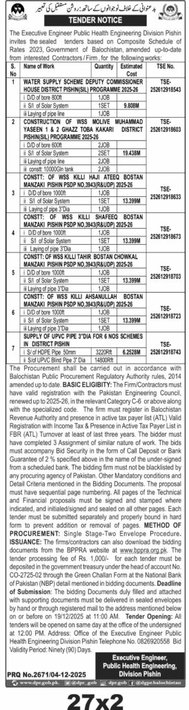 Eligibility criteria include valid PEC registration, tax compliance, and prior experience. Bids must be submitted in sealed envelopes by hand or registered mail by 19th December 2025 at 11:00 AM. Tender opening will be on the same day at 12:00 PM at the Public Health Engineering Division Pishin office.