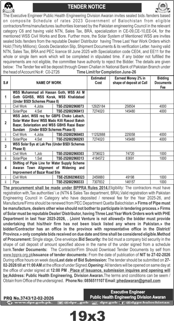 The submission deadline is set for 27th February 2026 at 11:00 AM, with bid opening at 12:00 PM on the same day at the Public Health Engineering Division Awaran office. Tender documents are downloadable from the BPPRA website. Earnest money must be submitted as a call deposit receipt as specified.