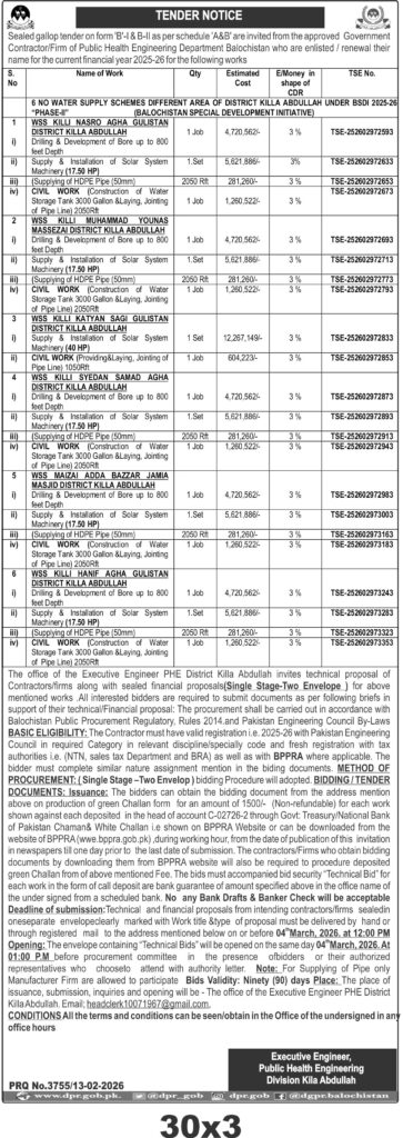 The submission deadline is set for 04 March 2026 at 12:00 PM, with technical bids opening the same day at 01:00 PM at the office of the Executive Engineer Public Health Engineering Division Killa Abdullah. Bidders must deliver sealed proposals by hand or registered mail to the specified address. The bidding documents are available upon payment of a non-refundable fee and can be downloaded from the BPPRA website.