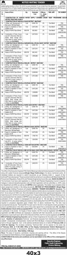 The submission deadline is set for 6th February 2025 at 11:00 AM, with the technical bids opening on the same day at 11:30 AM at the office of the Deputy Commissioner District Mastung. Bidders must submit their documents physically in sealed envelopes to the specified office address. All terms and conditions are available at the office of the Executive Engineer, Public Health Engineering Division Mastung.