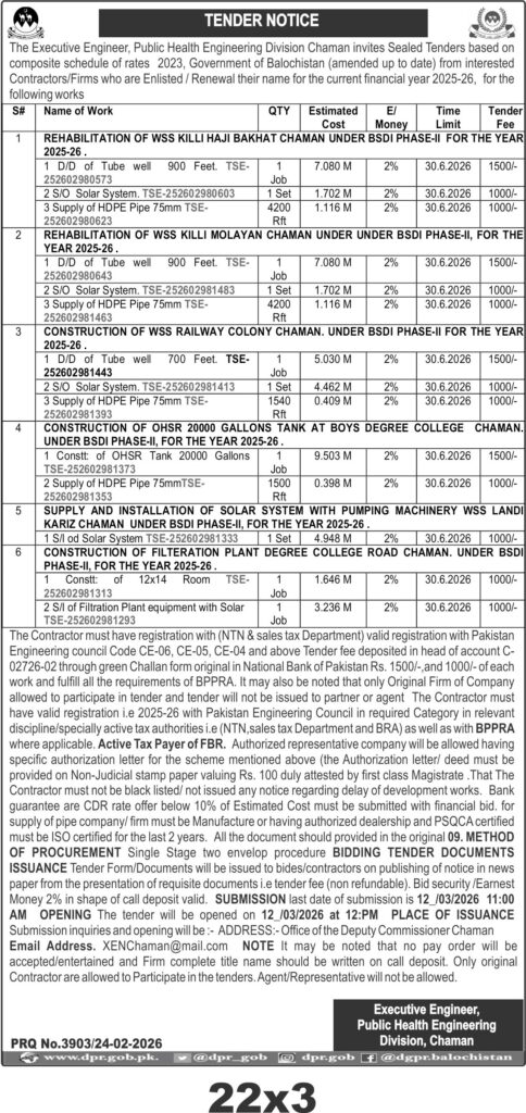 This tender invites contractors in Chaman from the Public Health Engineering Division for rehabilitation and construction of water supply schemes and installation of solar pumping systems under BSDI Phase-II for the financial year 2025-26. The scope includes tube well drilling, supply of HDPE pipes, construction of overhead storage tanks, and filtration plants, along with solar system installations. The projects are located in various sites within Chaman, requiring expertise in civil works and solar equipment integration to ensure sustainable water supply solutions.
