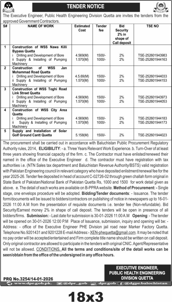 This tender invites bids from approved government contractors in Quetta for the construction of multiple Water Supply Schemes (WSS) and the supply and installation of solar equipment at the Golf Ground Cantt. The Public Health Engineering Division Quetta requires drilling and development of bore wells, along with the supply and installation of pumping machinery across various city locations including Nawa Killi Bypass, Jan Mohammad Road, Toghi Road Link Street, and City Area. Additionally, the project includes solar installation work at the Golf Ground Cantt Quetta.