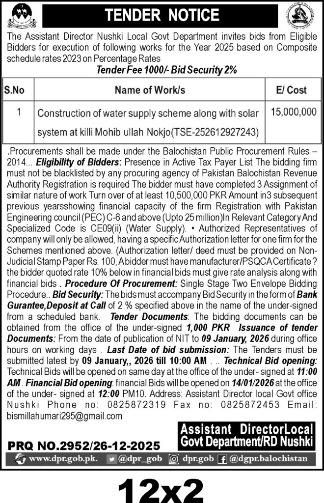 Authorized representatives with proper authorization letters may participate. Technical bids will be opened on the closing date at 11:00 AM and financial bids on 14 January 2026 at 12:00 PM. Contact details and submission instructions are provided by the Assistant Director Local Govt Department Nushki.