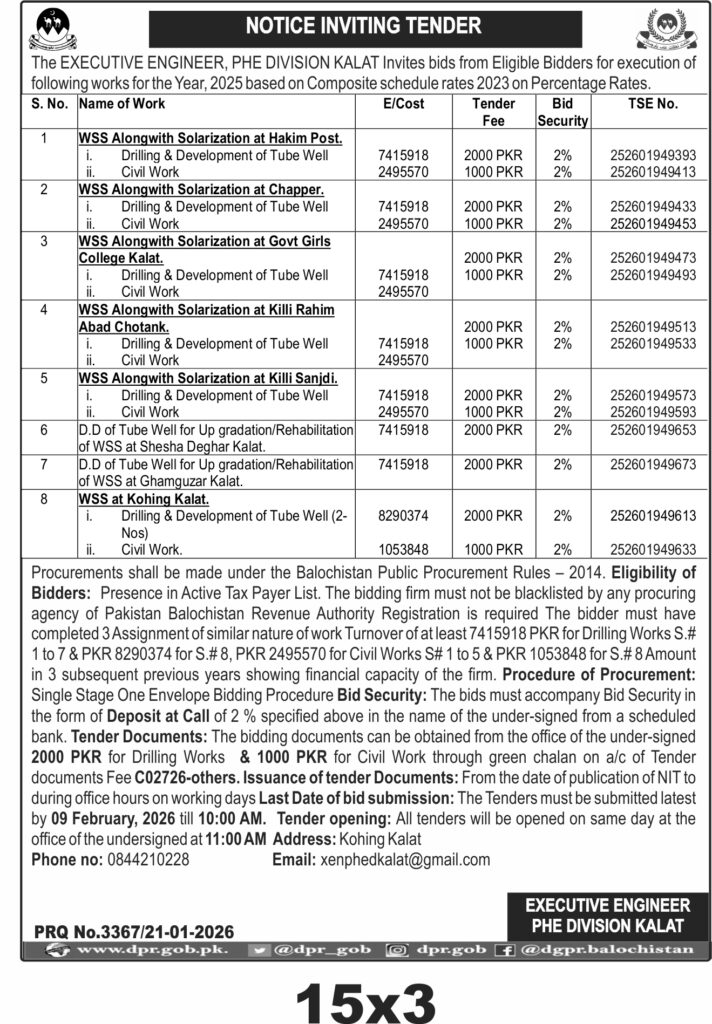 The submission deadline is set for 09 February 2026 at 10:00 AM, with tender opening at 11:00 AM on the same day at the PHED office in Kohing, Kalat. Interested bidders should ensure timely delivery of sealed bids to the designated address to avoid disqualification.