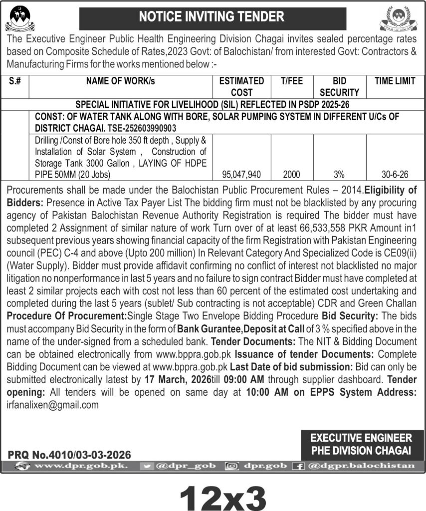 The bid submission deadline is set for 17 March 2026 at 09:00 AM via the supplier dashboard, with tender opening at 10:00 AM the same day on the EPPS system. Tender documents are available electronically at www.bppra.gob.pk. The physical address for correspondence is the Executive Engineer PHE Division Chagai.