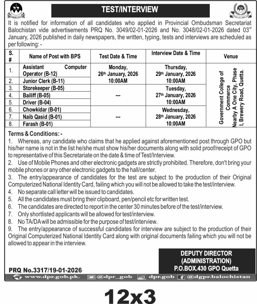 This notice from the Provincial Ombudsman Secretariat Balochistan in Quetta announces scheduled written and typing tests along with interviews for multiple posts including Assistant Computer Operator, Junior Clerk, Storekeeper, Bailiff, Driver, Chowkidar, Naib Qasid, and Farash. The recruitment process is set to take place at the Government College of Commerce, Phase I, Brewery Road, Quetta, ensuring candidates are assessed fairly for these essential administrative and support roles.