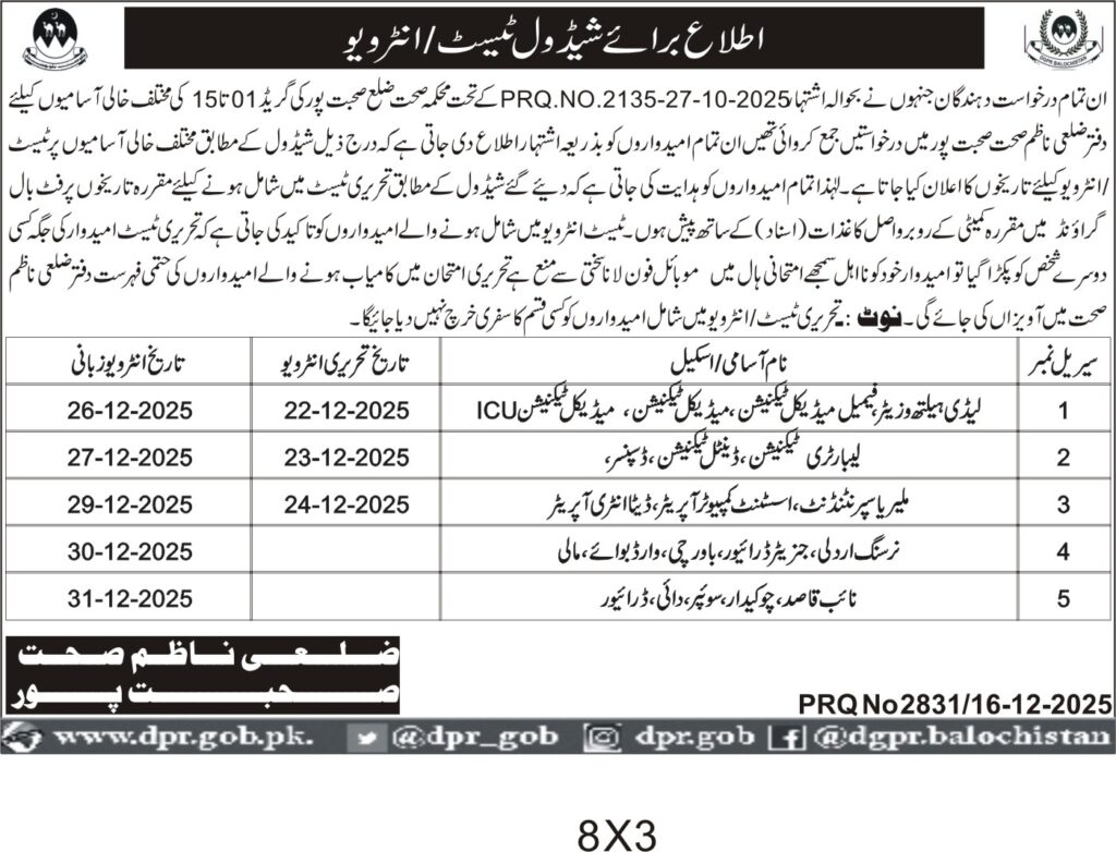 The recruitment process includes written tests and interviews scheduled between 22-12-2025 and 31-12-2025 for various posts such as lady health workers, laboratory technicians, medical technicians, and drivers. Candidates must meet eligibility criteria and appear for tests at the district health office.