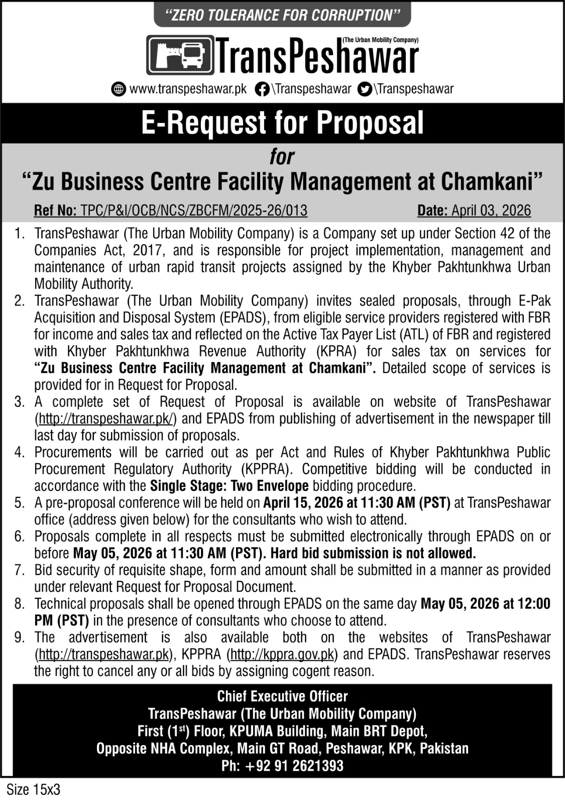 This tender invites proposals for facility management services at Zu Business Centre located in Chamkani, Peshawar, issued by TransPeshawar (The Urban Mobility Company). The scope covers comprehensive facility management to ensure smooth operations and maintenance of the business centre.